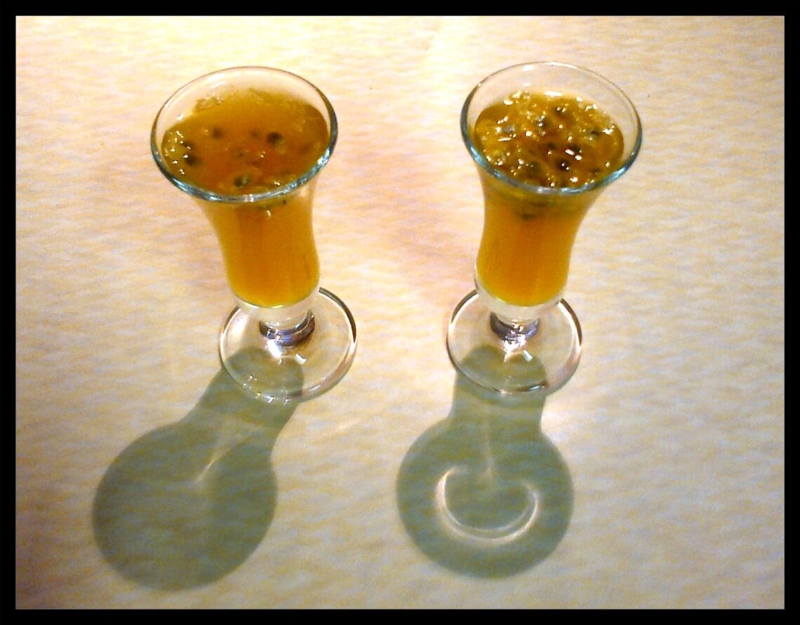 We discovered a local restaurant in Mauritius with a very smooth waiter who, after much pleading on our part, revealed his secret “Granadilla Shooter” recipe to us. We’ve made it a few times since then. It gives you that happy, summertime-island feeling. 😉 It’s always quite a hit!