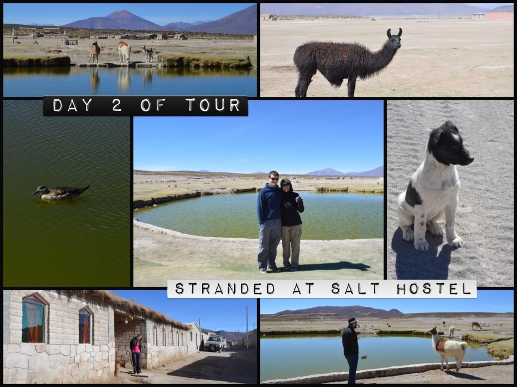 Here we are with four fellow disappointed group members sitting outside the Salt Hostel we stayed at last night by a little man-made pond with one duck swimming in it and some llamas occasionally drinking some water. The sky is bright blue and there’s a chilly breeze blowing.