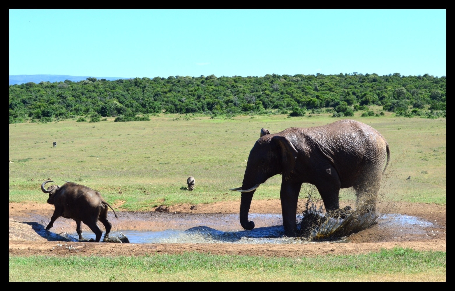 The thermometer on our car measured the outside temperature as 46 degrees Celsius! Addo was boiling hot that day which made it good to see elephants because they were all at different waterholes. It was the first time I saw elephants swim! I’ve seen them splashing themselves before but these elephants were fully submerged in the water, some on their sides and some just wallowing. It looked like they were having a good time.