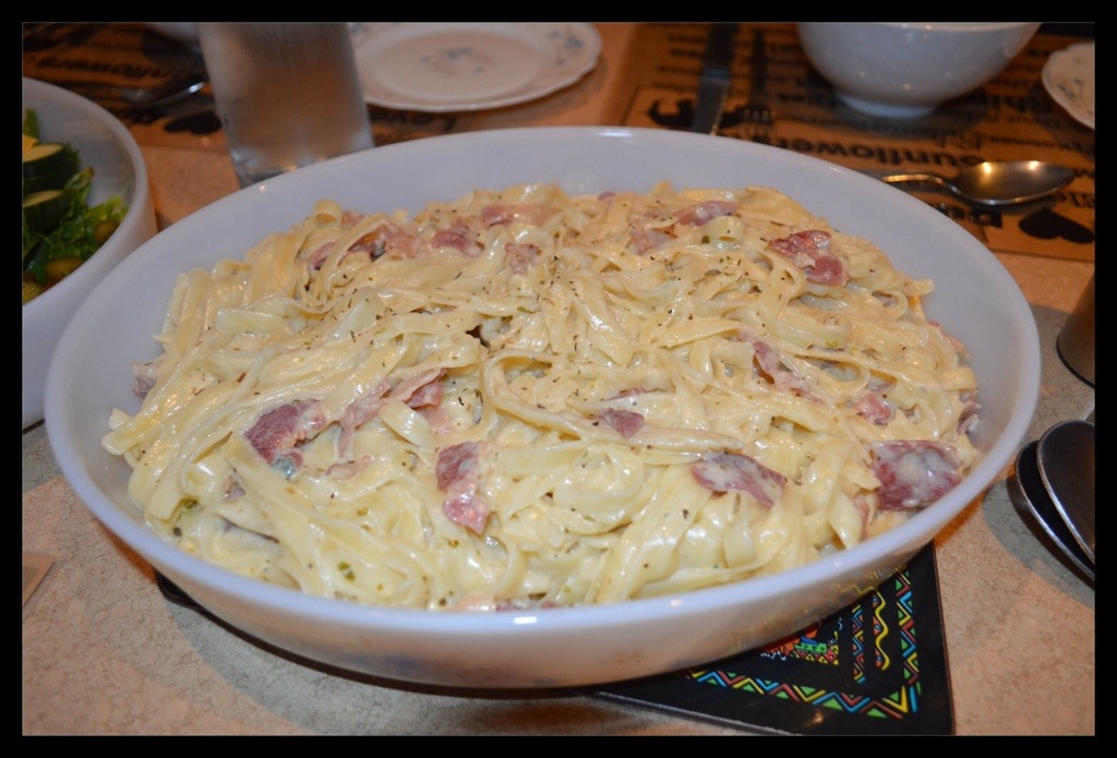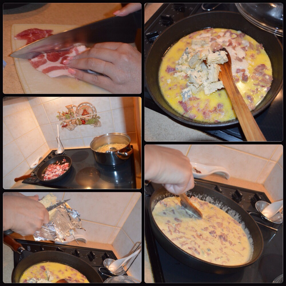 After making the pasta and draining the excess water from the pasta, add contents of frying pan to the pasta. Mix together. Serve and enjoy!