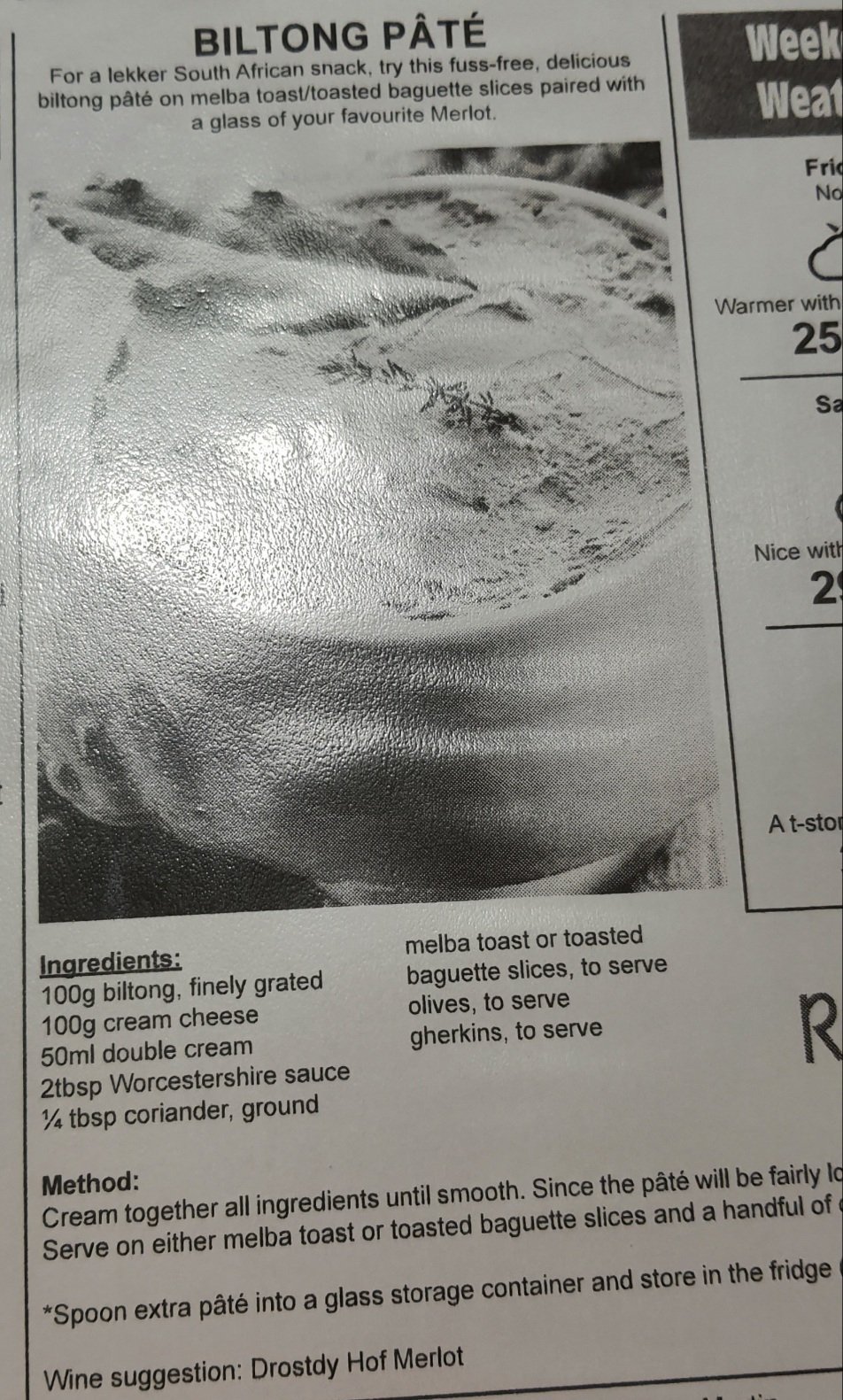 Mix these ingredients together. (I use an electric beater.) Leave a bit of biltong powder to sprinkle on top. Serve with Melba toast or other crackers.