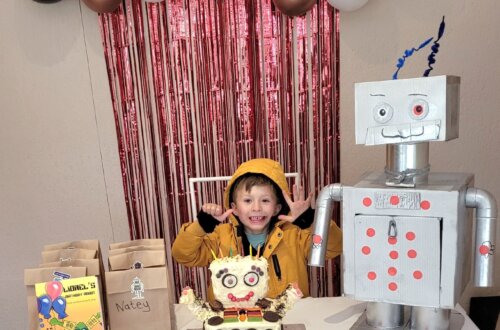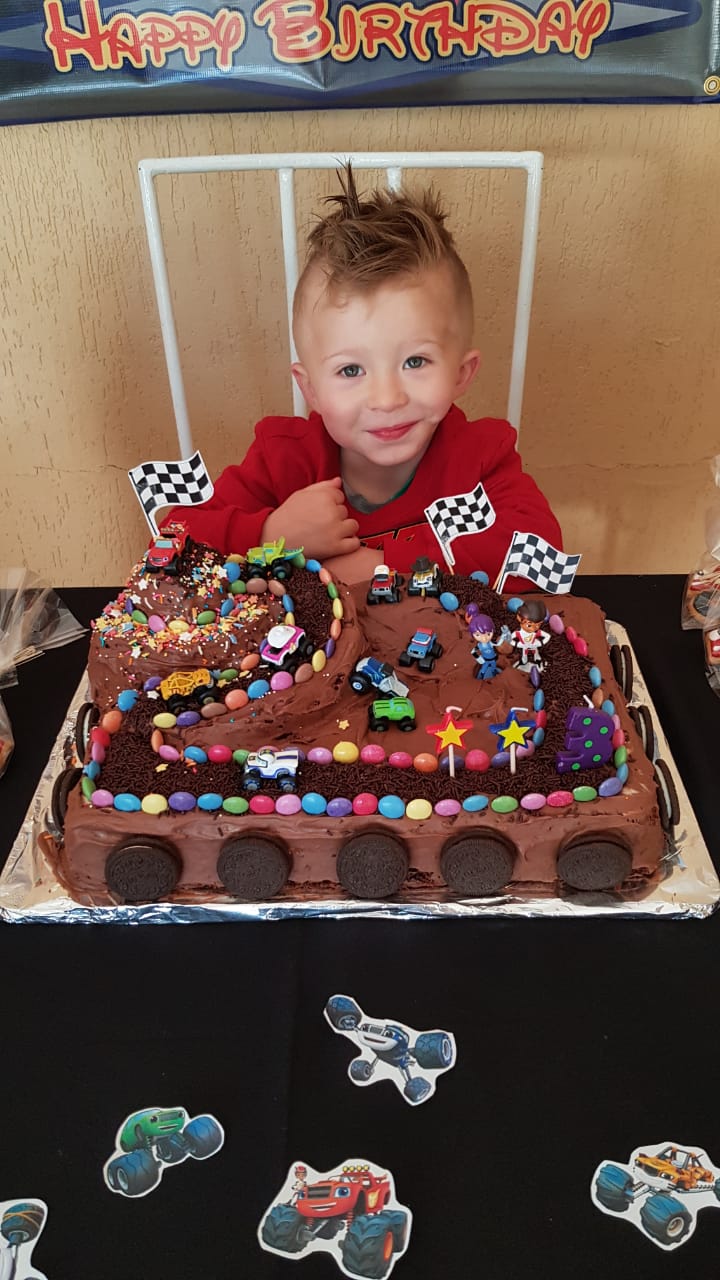 We had a blazing good time celebrating Leo’s birthday this year. I used Daleen’s chocolate cake recipe to make a “Blaze and the Monster Machines Mud cake.” It is really a yummy, fluffy cake. It tasted really good with the chocolate cream cheese icing I made. Marc got the little Blaze characters online. Leo really liked his cake! Will post some more pics of the party and our Blaze piñata in next post.