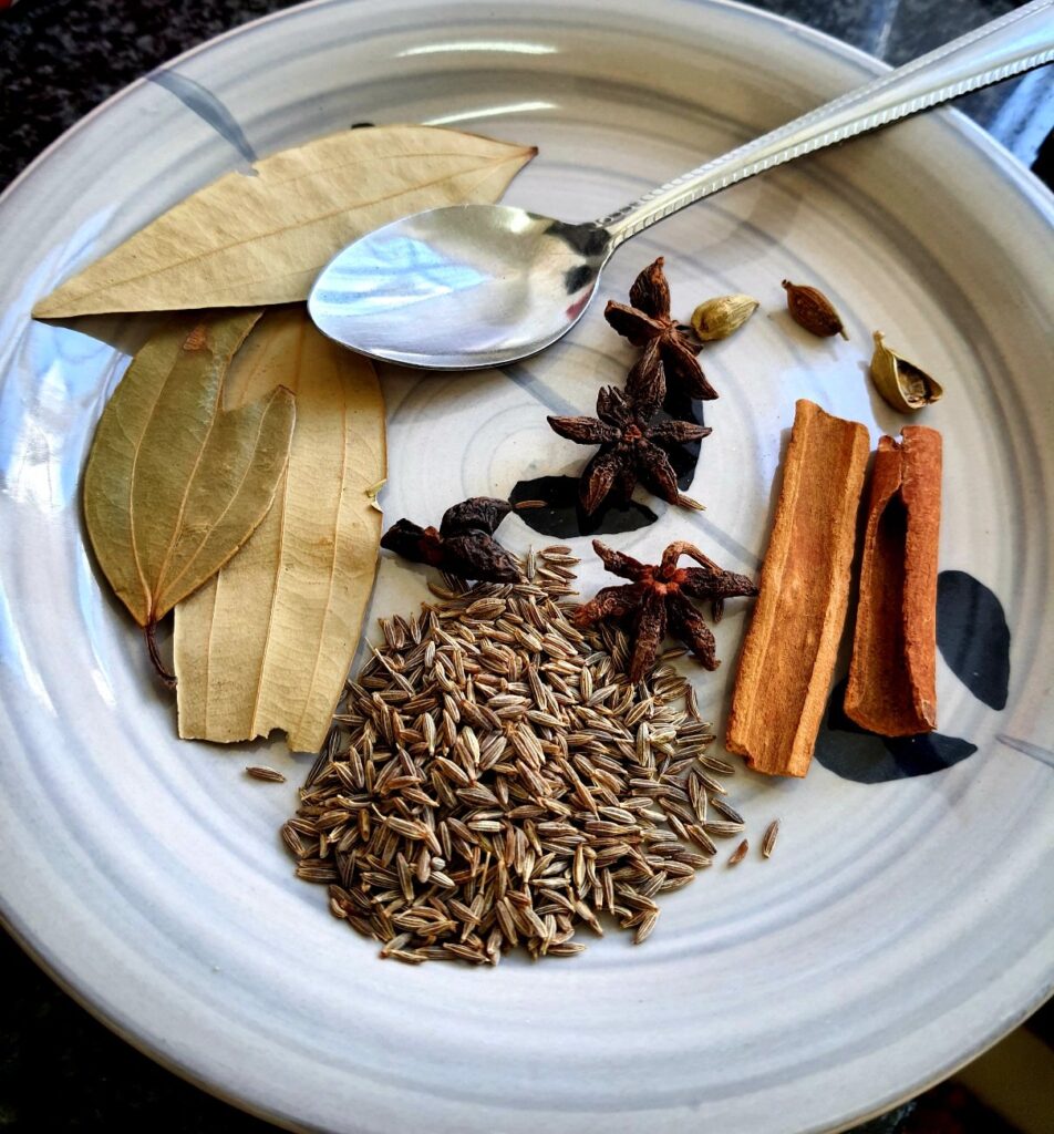 Spices: 1 teaspoon cumin seeds, 4 cardamon seeds, star aniseed, curry leaves, cinnamon sticks, 1 teaspoon turmeric, 1 teaspoon Raj curry spice, 2 teasspoons mixed masala, 1 teaspoon brijani mix