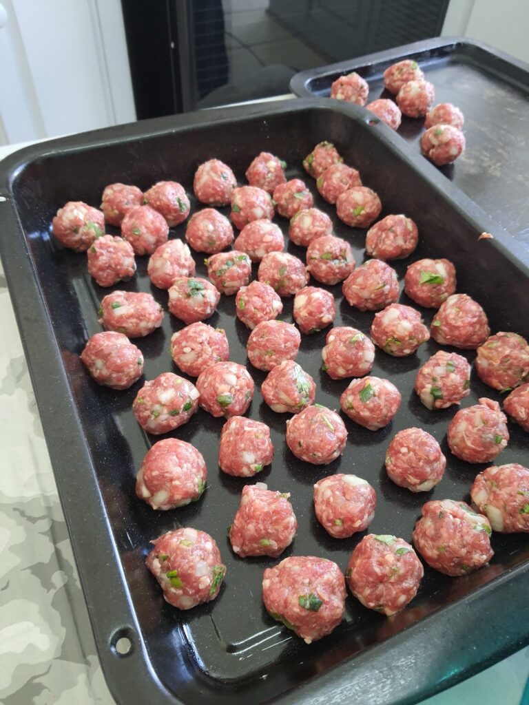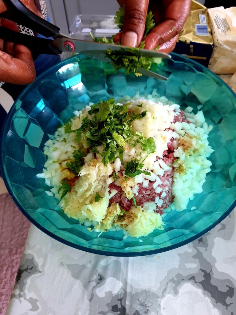 1kg mince, grated garlic, grated ginger, 2 medium sized onions chopped fine, 2 eggs, half a teaspoon salt, fresh chopped coriander. (and spring onion and more fresh coriander as garnish)
