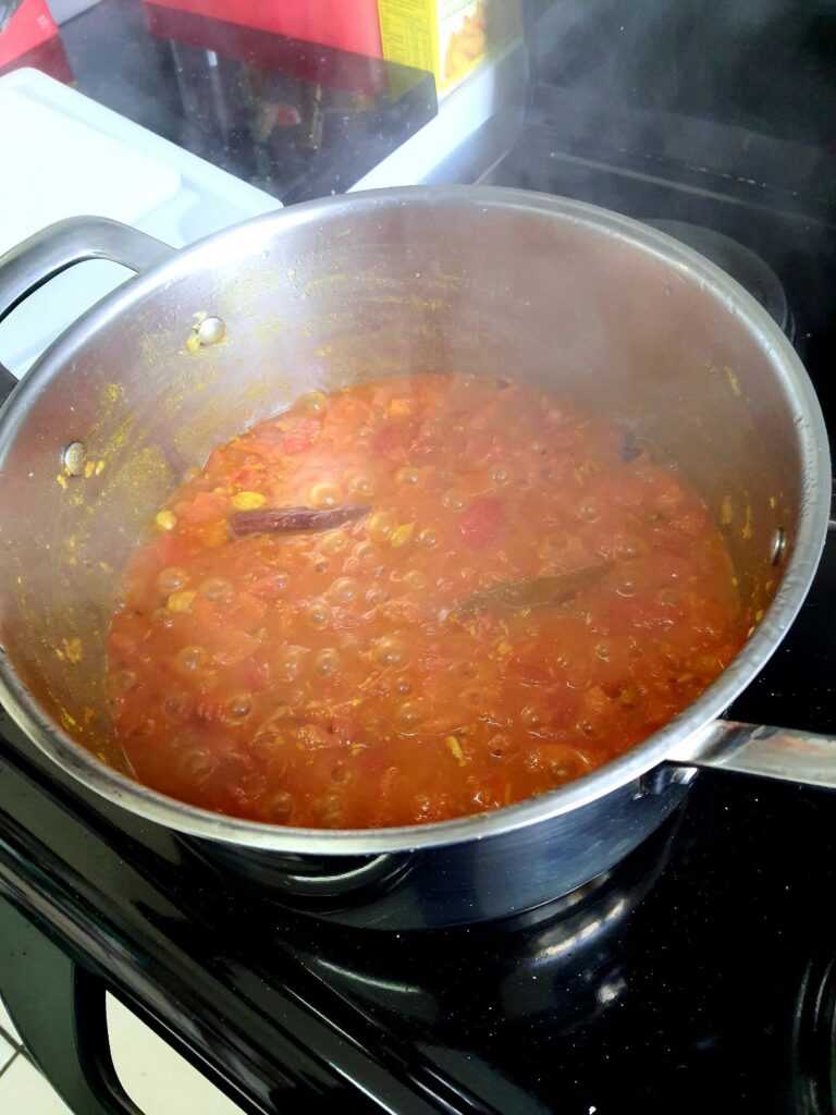 Ingredients: Some oil, 1 chopped onion, 8 large chopped tomatoes, grated ginger, grated/crushed garlic, 1 heaped teaspoon salt, 1 teaspoon Worcestershire sauce, 1 teaspoon sugar, spices…