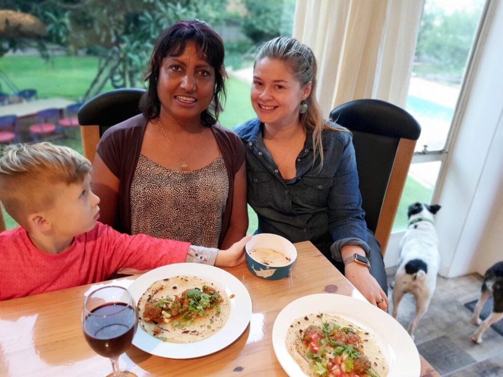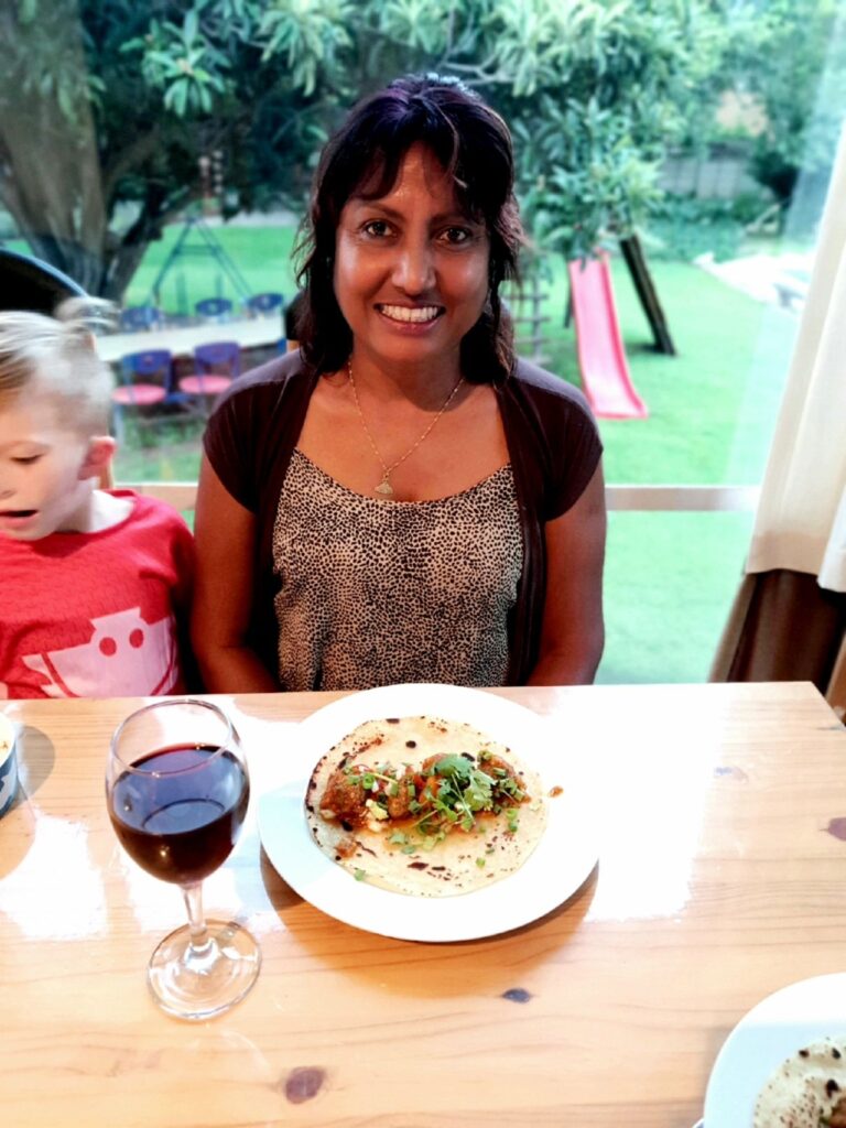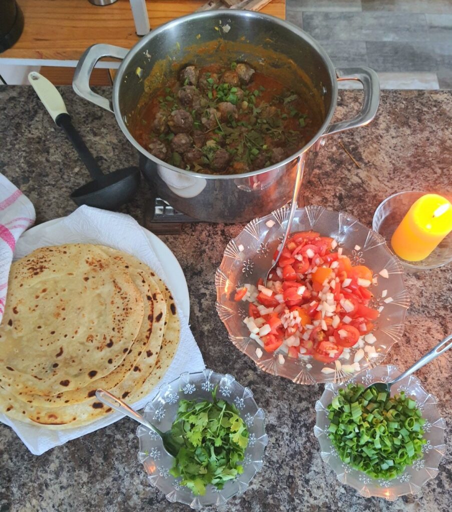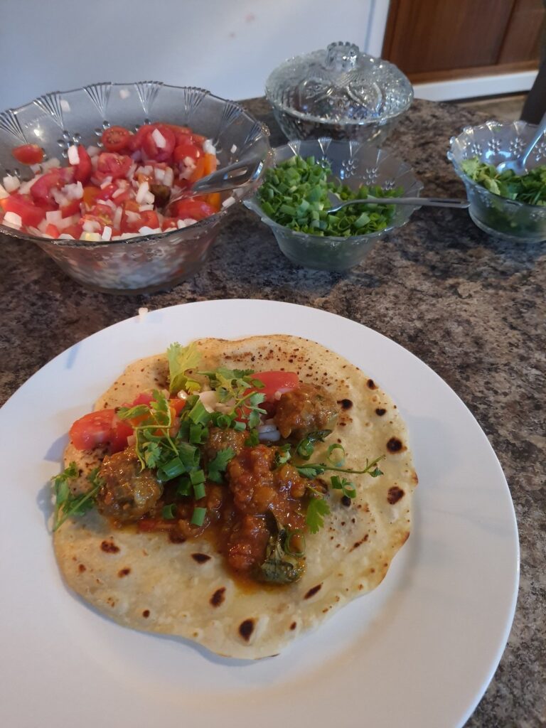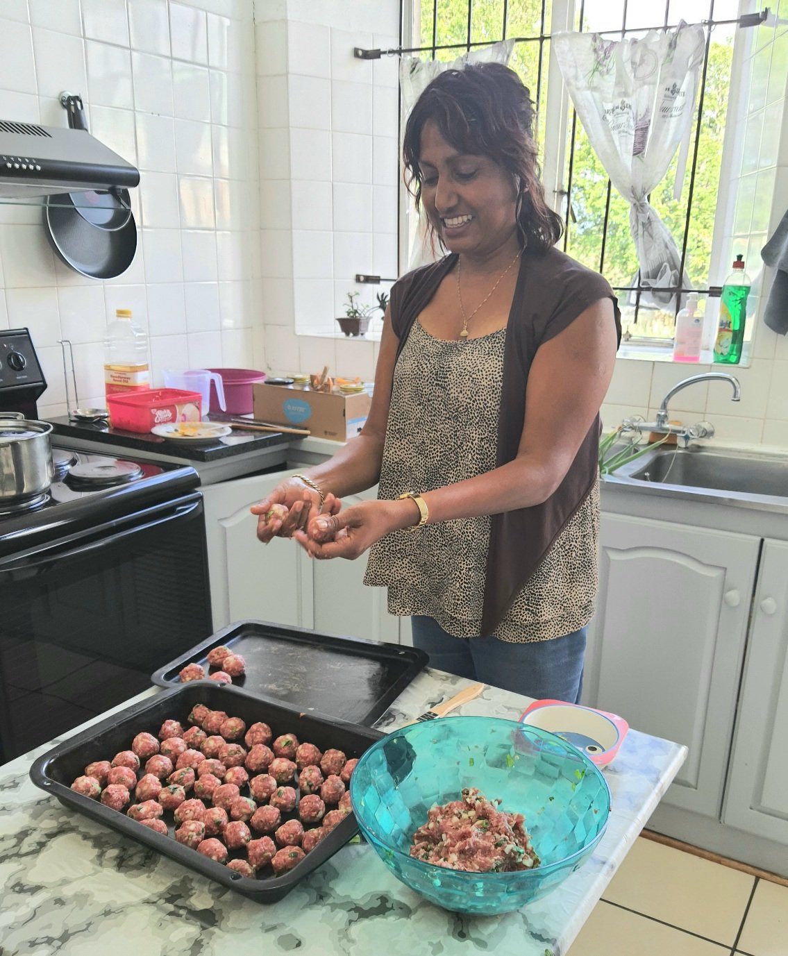 Geetha came to show us how to make her famous meatballs in tomato chutney dish. She also showed us how to make our own rotis… With the rotis I still need a lot of practice! But I have since made the meatballs by myself and they came out yummy!