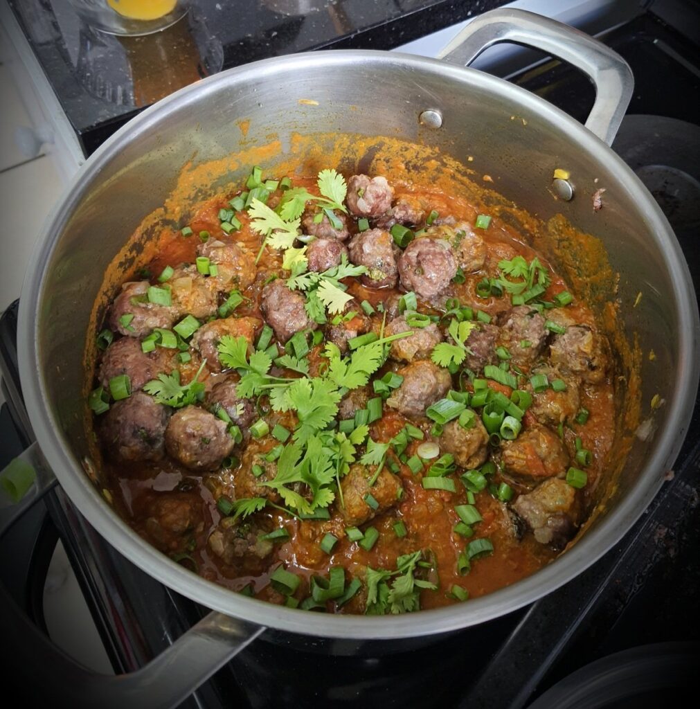 Meatballs in Tomato Chutney garnished with fresh coriander and spring onions