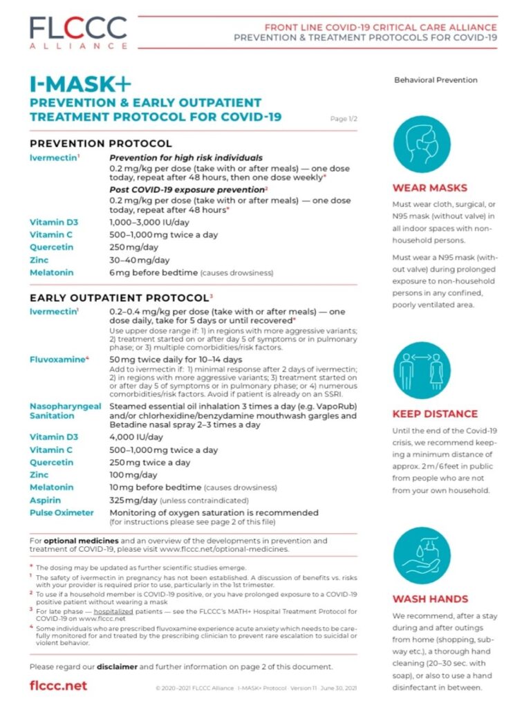 - Vitamins : Vitamin C, Vit D3, Vit B complex, Vitamin B3, Zinc (see FLCCC image below for dosages. Don’t overdo the dosages!)