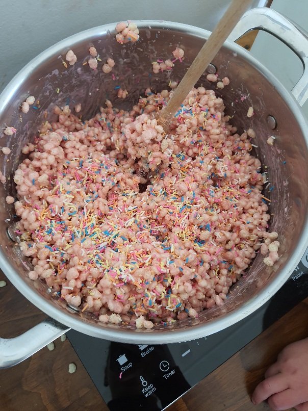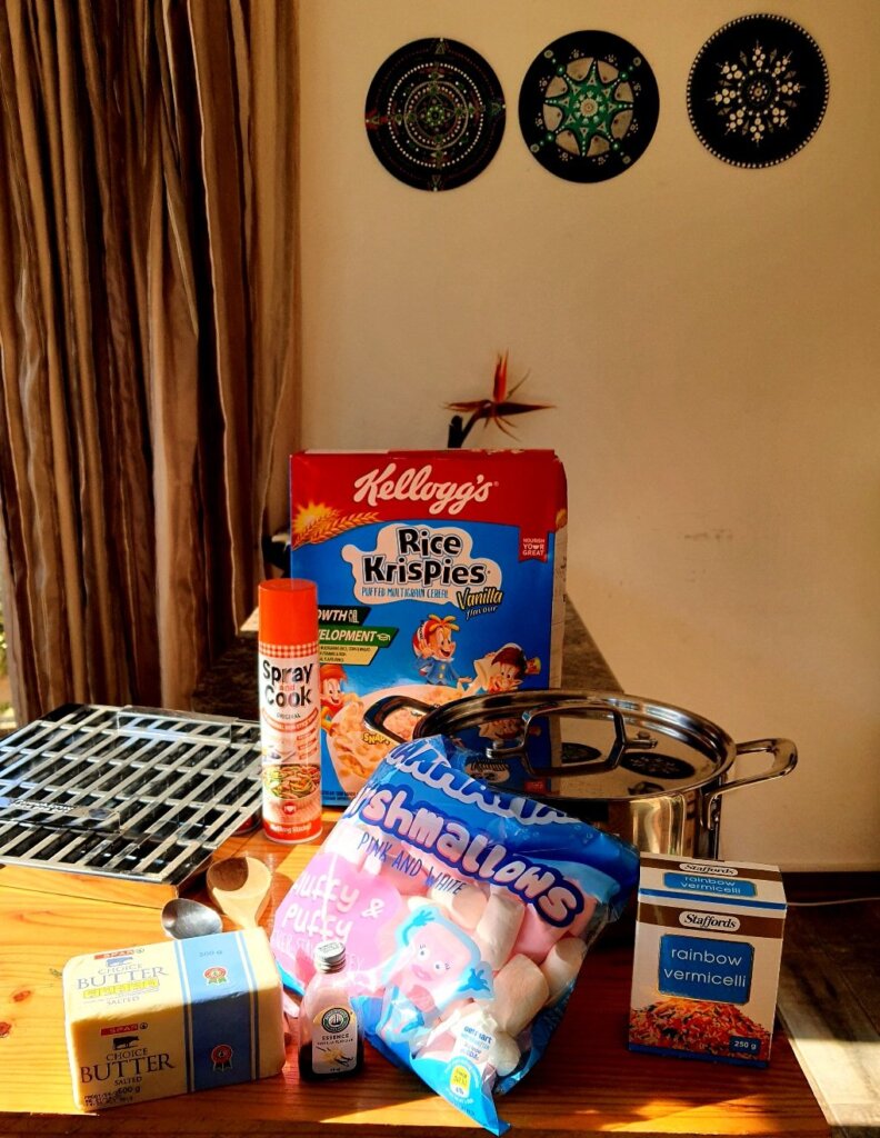 Melt the butter and Marshmallows together in a pot. Take off heat then add vanilla essence and stir. Then add the Rice Krispies and vermicelli and mix.