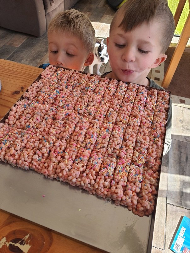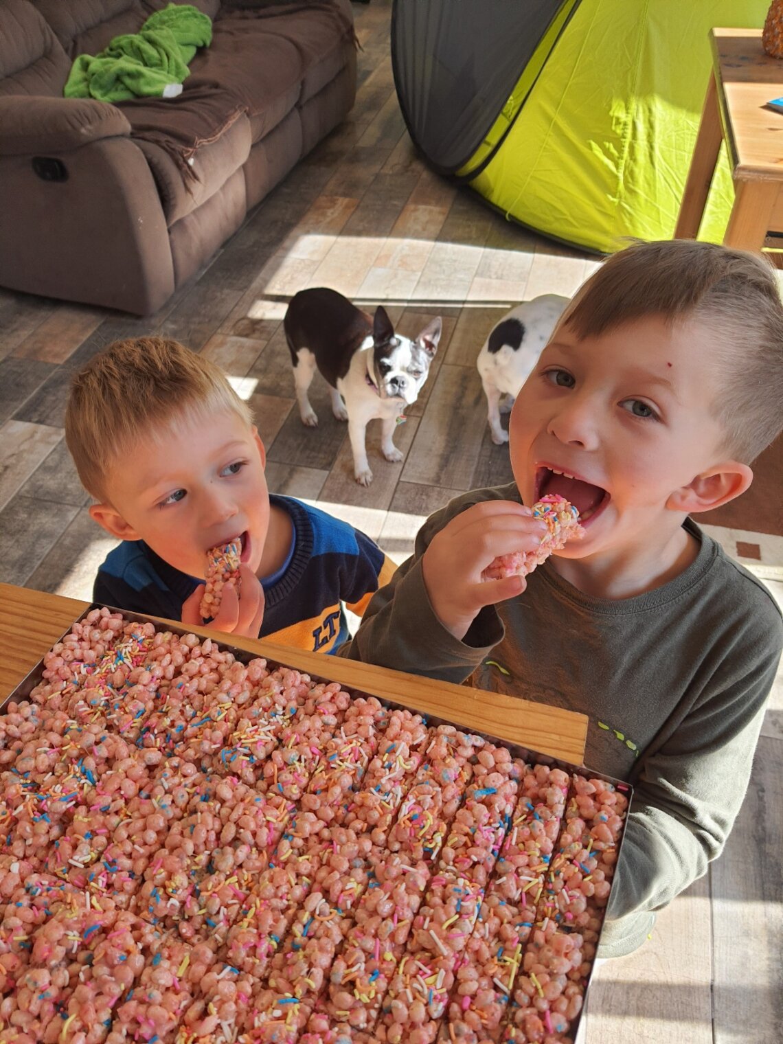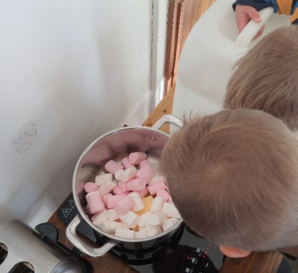 I was craving these treats! So I made them “for the kids.” Leo and Natey helped me count the Marshmallows to put in the pot. They look fun and are really yummy.