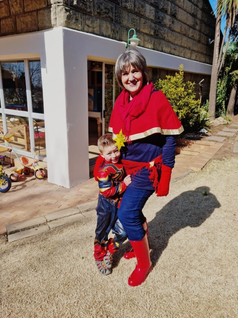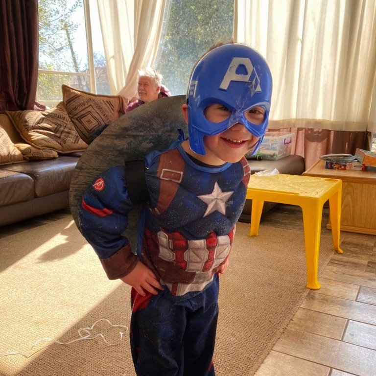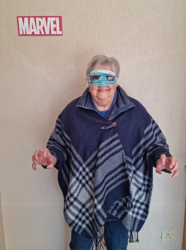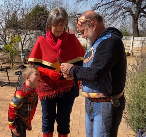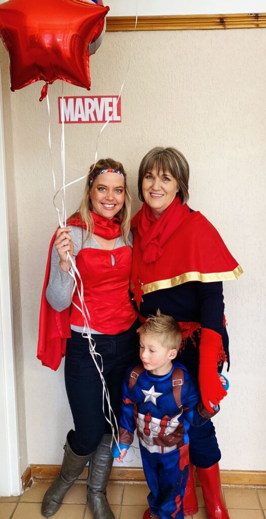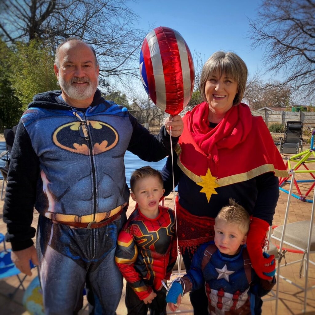 Leo was spiderman (the Avengers version), Natey was captain America, Marcus was Thor and I was Black Widow. The oupas and oumas were Cat-woman, Stan Lee, Captain Marvel, Batman, Storm and Captain Covid. Linley was Scarlett Witch.