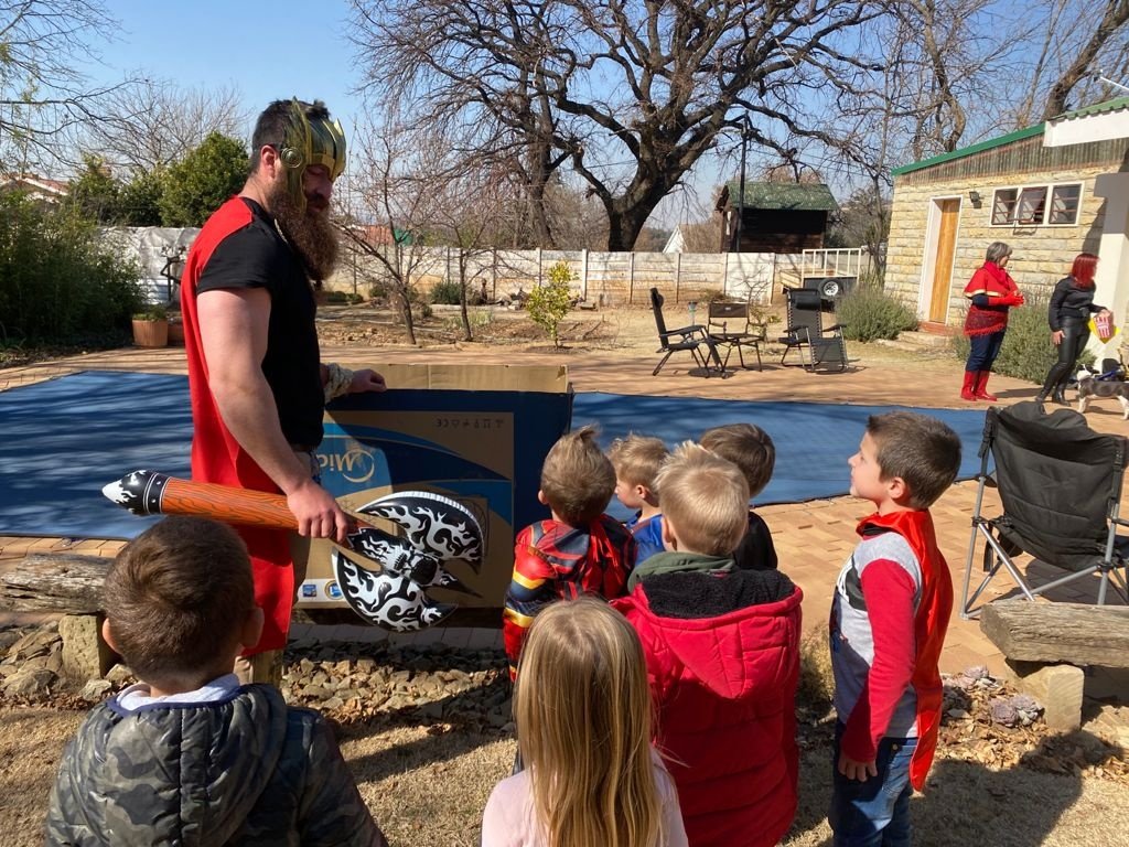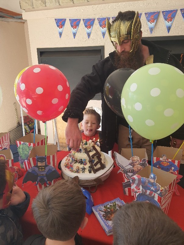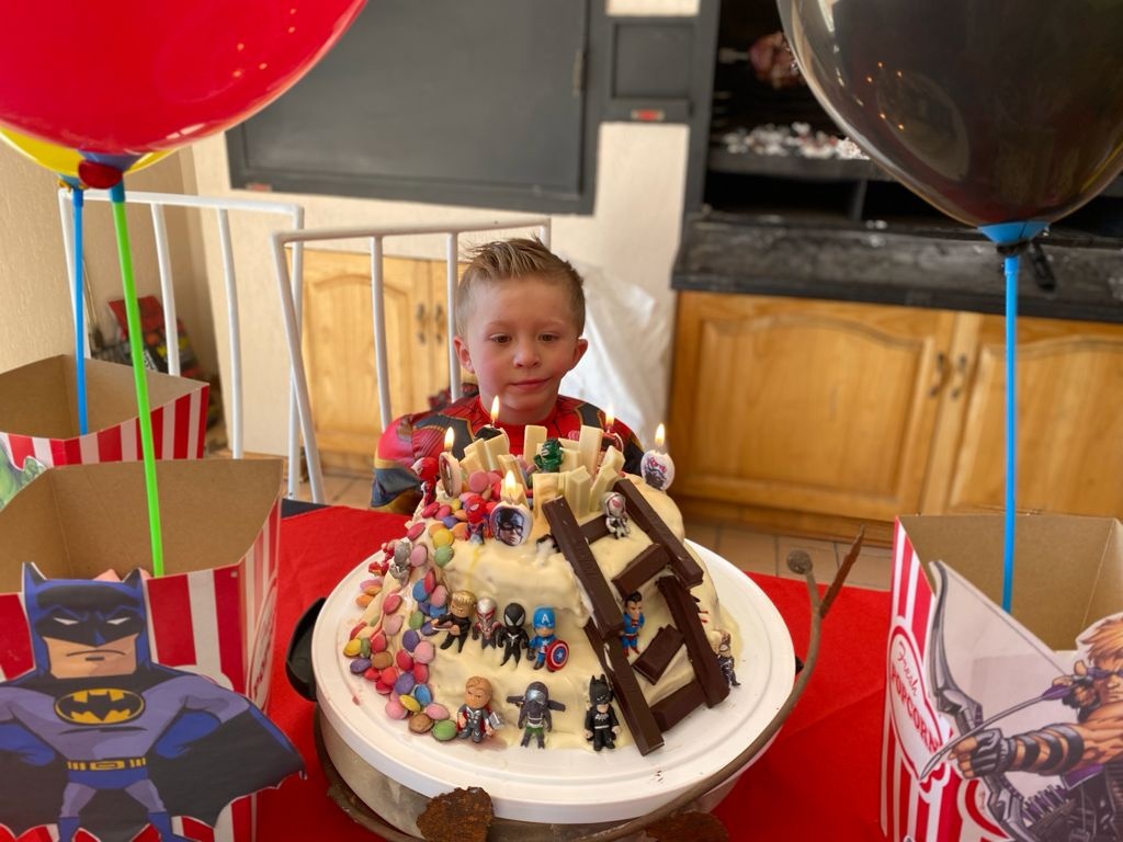 We ate some spit-braaied skaapboud, stamptert (thank you, Captain Marvel) and salad. We made superhero popcorn for the kids and everyone ate some cake for pudding.