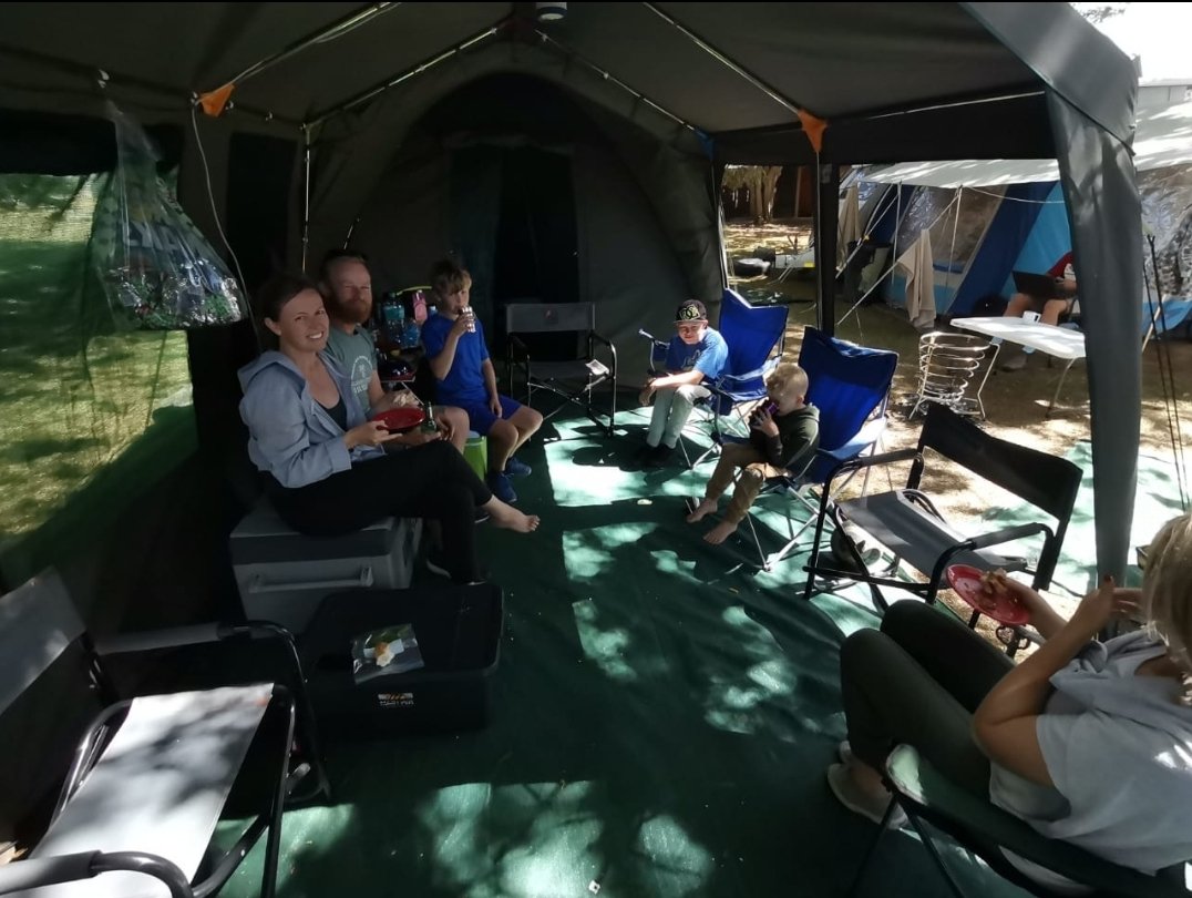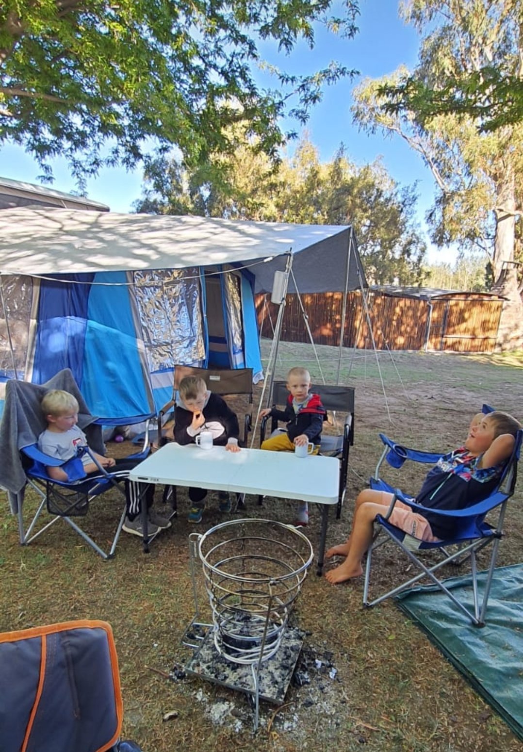 We braaied the Friday evening, had preggo rolls on Saturday for lunch and Driekie and Milene made a potjie for supper. (I need that sauce recipe, Milene!) Adri made an absolutely delicious salad and she made breakfast with Mike and Minette this morning. Maggie had a good idea to bring cheese, biscuits and fruit which she put out as a snack platter just when we were finished setting up our tents.