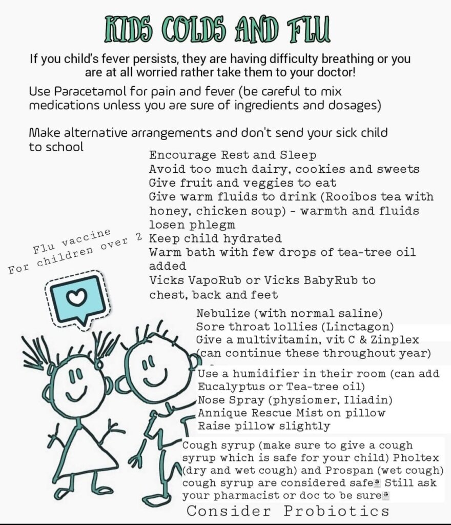14. Other medication: (Once again be sure of the dosages you are giving your child and be aware that some medications contain a combination of ingredients – which makes it easier to overdose.) An Anti-histamine ( like Allergex syrup, Telfast Syrup or Cetirizine syrup) helps dry secretions. It can also make a child drowsy…so better to give it at night. You can also give them something to make mucus thinner like Mucospect or ACC. This helps make it easier for them to cough out phlegm.