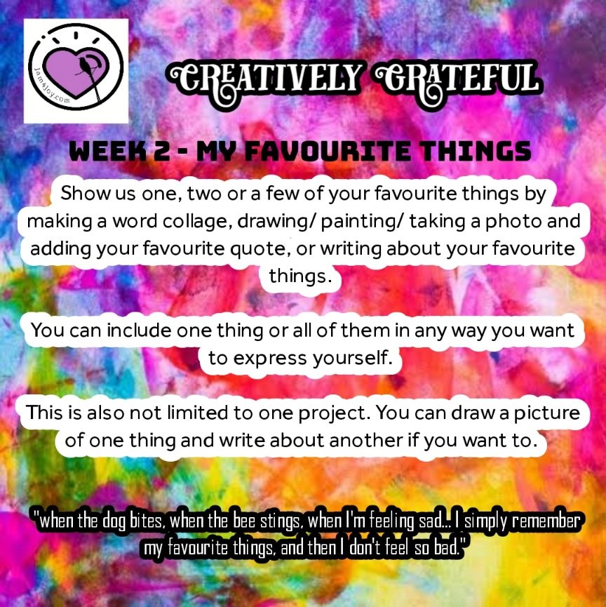 Show us one, two or a few of your favourite things by making a word collage, drawing or painting one of your favourite things, take a photo and adding your favourite quote, writing about your favourite things.