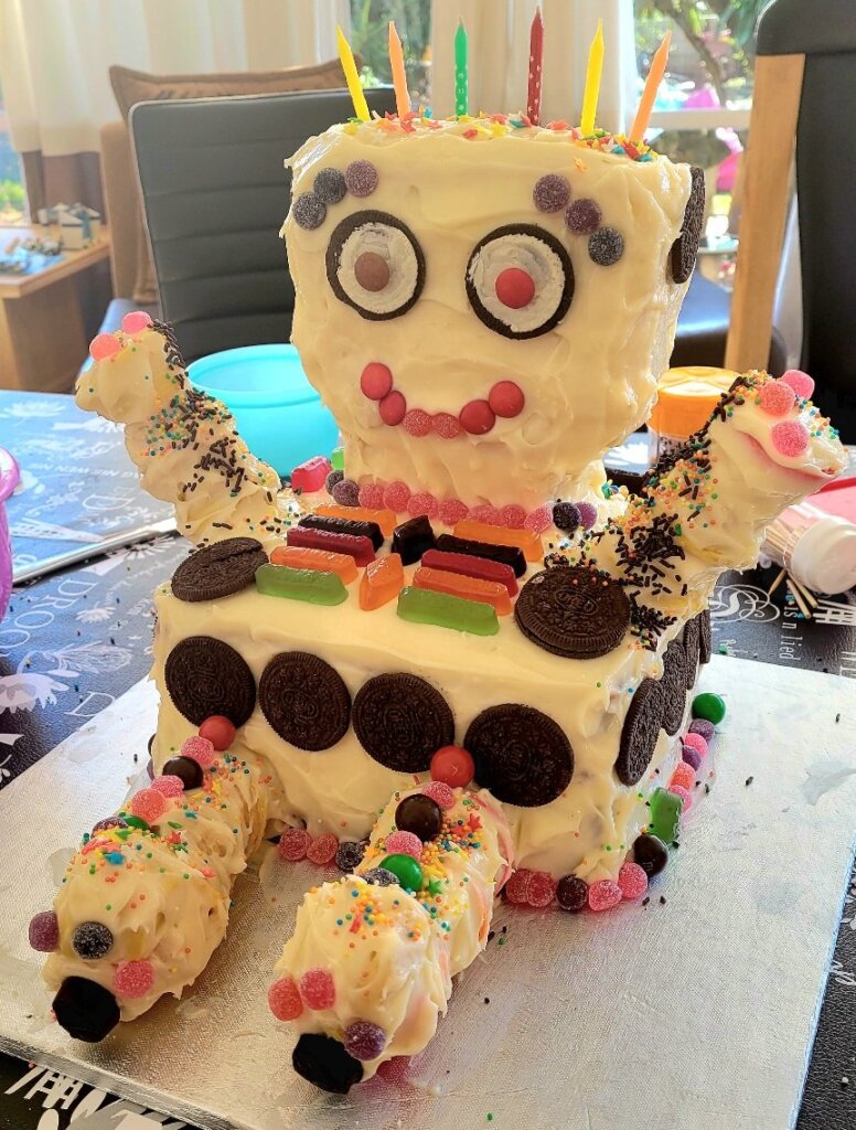We also baked some cupcakes and made a robot cake. The body of the robot cake was chocolate carrot cake with cream cheese icing! A really delicious combo.