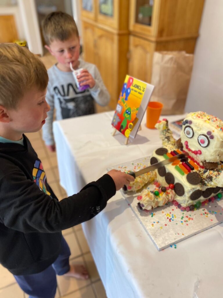Everyone had fun playing, chatting and sliding down the big jumping castle slide. I read “Lionel’s Birthday Robot” to our guests and we all sang “Happy Birthday.” The plan was to only cut and eat the cake for pudding but nobody could wait so we had the cake for starters. Leo was very spoilt with thoughtful presents from his friends and family.