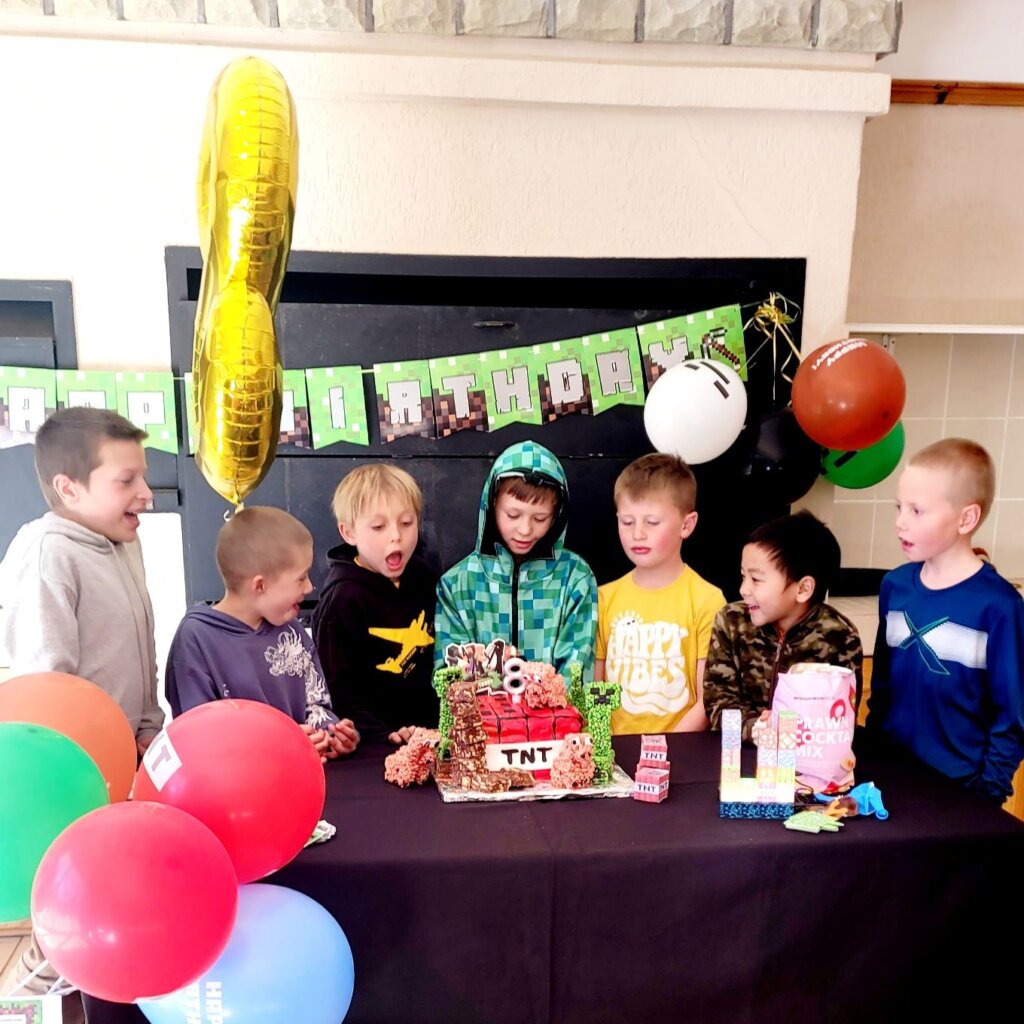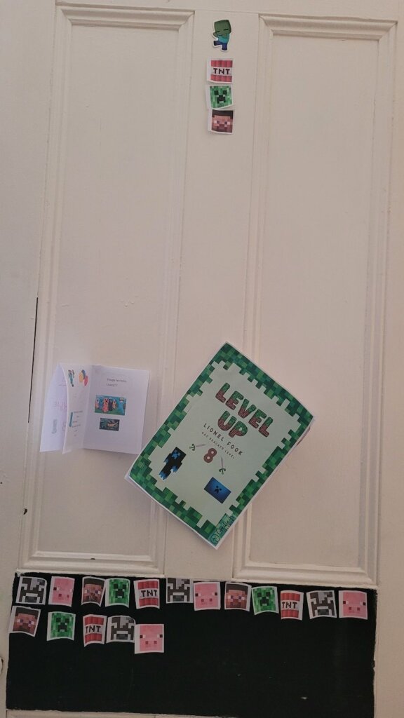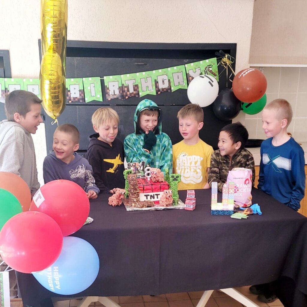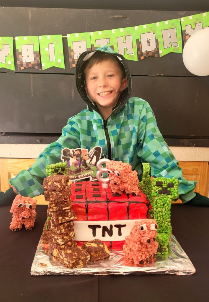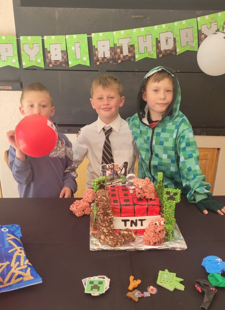 The TNT minecraft Cake… I was initially critical because it didn’t come out exactly as what I planned, but the kids loved it! Minecraft Balloons and bunting from Temu. The soft-toy zombie hid in a different place in our house every day in July. Every Morning the kids have to find it. The birthday countdown – minecraft squares. Leo had to move one square every day, until no more squares were left. Matthew made my day when he ran to his mom when she came to fetch him and told her about the rice krispie creepers on the cake! Blow out the TNT! You’re TNT! You’re dynamite! The Cake was a vanilla buttermilk cake with cream cheese icing. Pigs and creepers on the cake were rice krispie treats and the square ground blocks were Marie Biscuit squares.