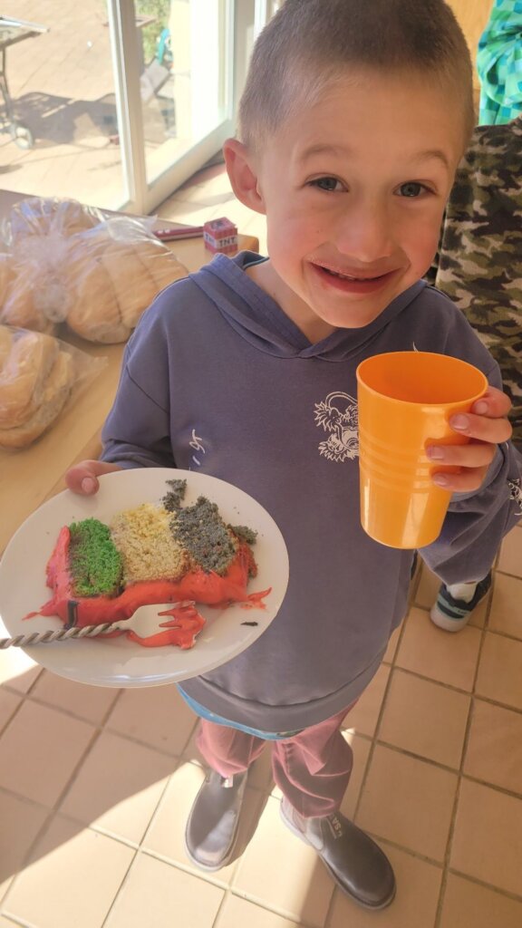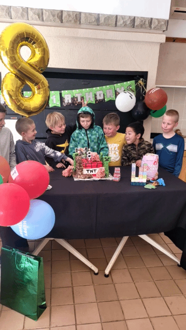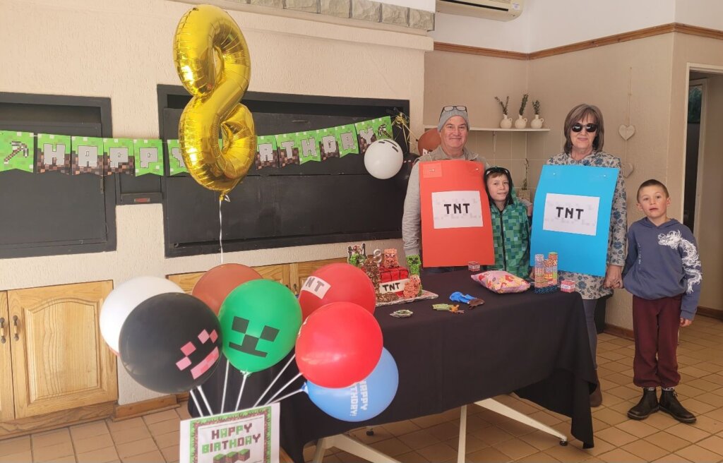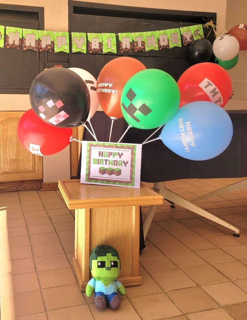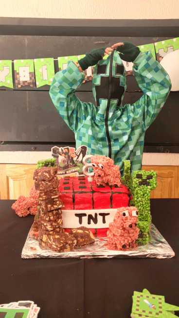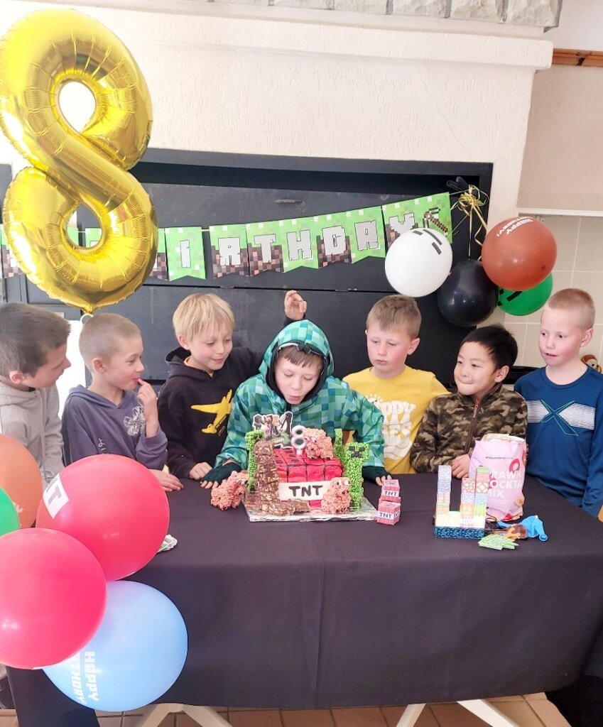The TNT minecraft Cake… I was initially critical because it didn’t come out exactly as what I planned, but the kids loved it! Minecraft Balloons and bunting from Temu. The soft-toy zombie hid in a different place in our house every day in July. Every Morning the kids have to find it. The birthday countdown – minecraft squares. Leo had to move one square every day, until no more squares were left. Matthew made my day when he ran to his mom when she came to fetch him and told her about the rice krispie creepers on the cake! Blow out the TNT! You’re TNT! You’re dynamite! The Cake was a vanilla buttermilk cake with cream cheese icing. Pigs and creepers on the cake were rice krispie treats and the square ground blocks were Marie Biscuit squares.
