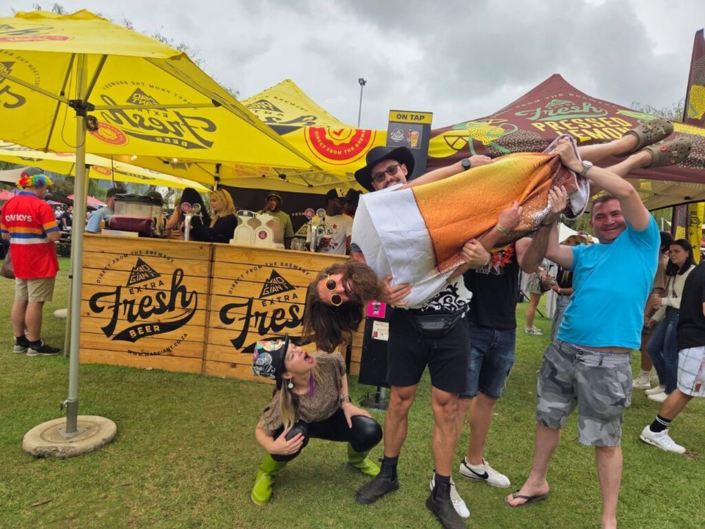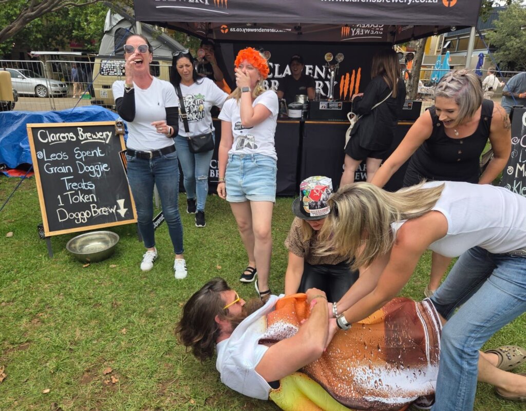 Since Marcus was a beer, he had the idea for a fun photo where the guys would hold him while I pretended to drink him. Then, someone suggested that the ladies should hold him instead—it might make for an even cooler picture. So we went with that idea, and our group of ladies lifted him… and then dropped him! Safe to say, I won’t be asking any of them to “Hou my dop” again! At least we won a box of beer at Clarens Brewery for that photo!