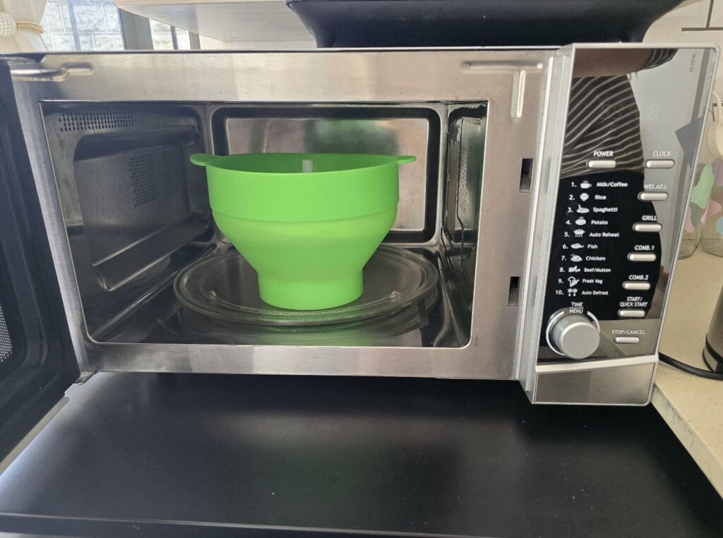 I airpop my popcorn in the microwave.  I have a silicone popcorn popper, which works amazingly. Just make sure it’s not the cheapest silicone because then it may smell like plastic… I know some people don’t like microwaves…. but from what I have read, they are not too bad… maybe I must write a post on microwaves sometime.