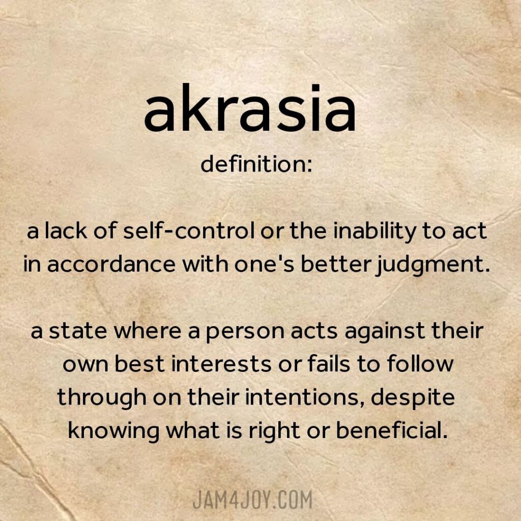 Akrasia is doing something against your best interest, even when you know it’s not for your best interest.  People with akrasia are-crazy-ja!🤣 (Not really, they’re quite normal.)