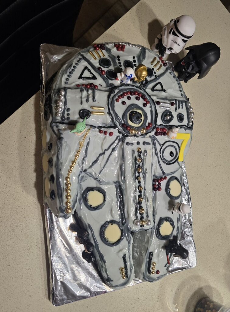 Millenium Falcon Cake – chocolate cake with cream cheese icing…works every time