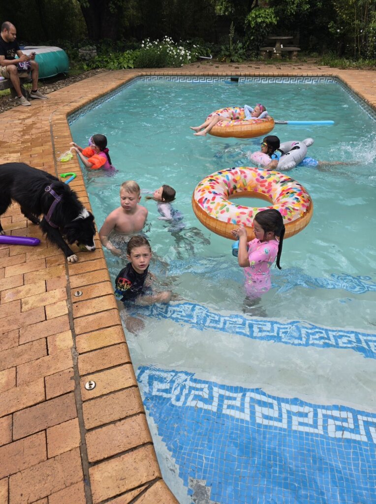 To be honest, a kids’ pool party might be too much for the human nervous system, definitely for mine.  Next time, maybe we will do something calmer, like watching a movie. It’s much less stressful and much drier.